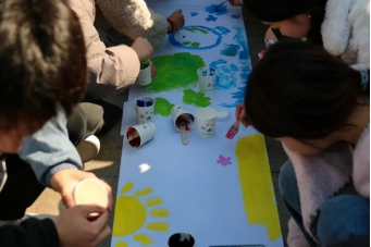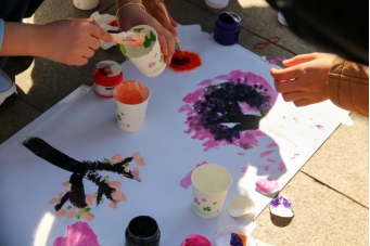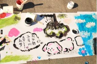 每四人一组,以“我眼中的春天”为题,在长卷上进行绘画创作。