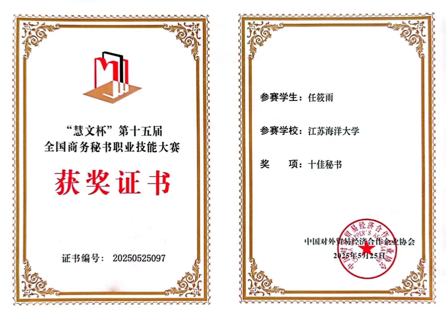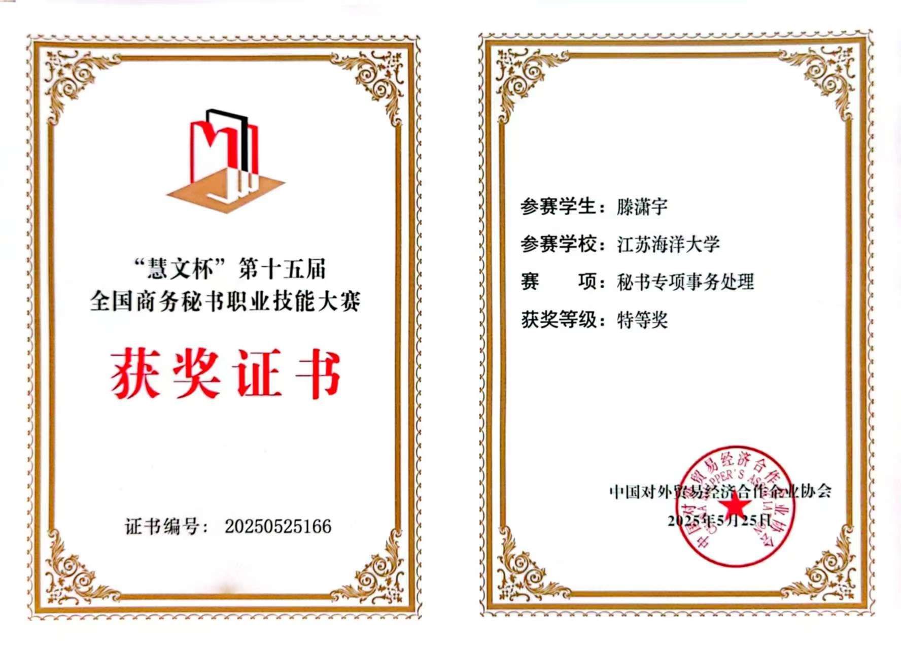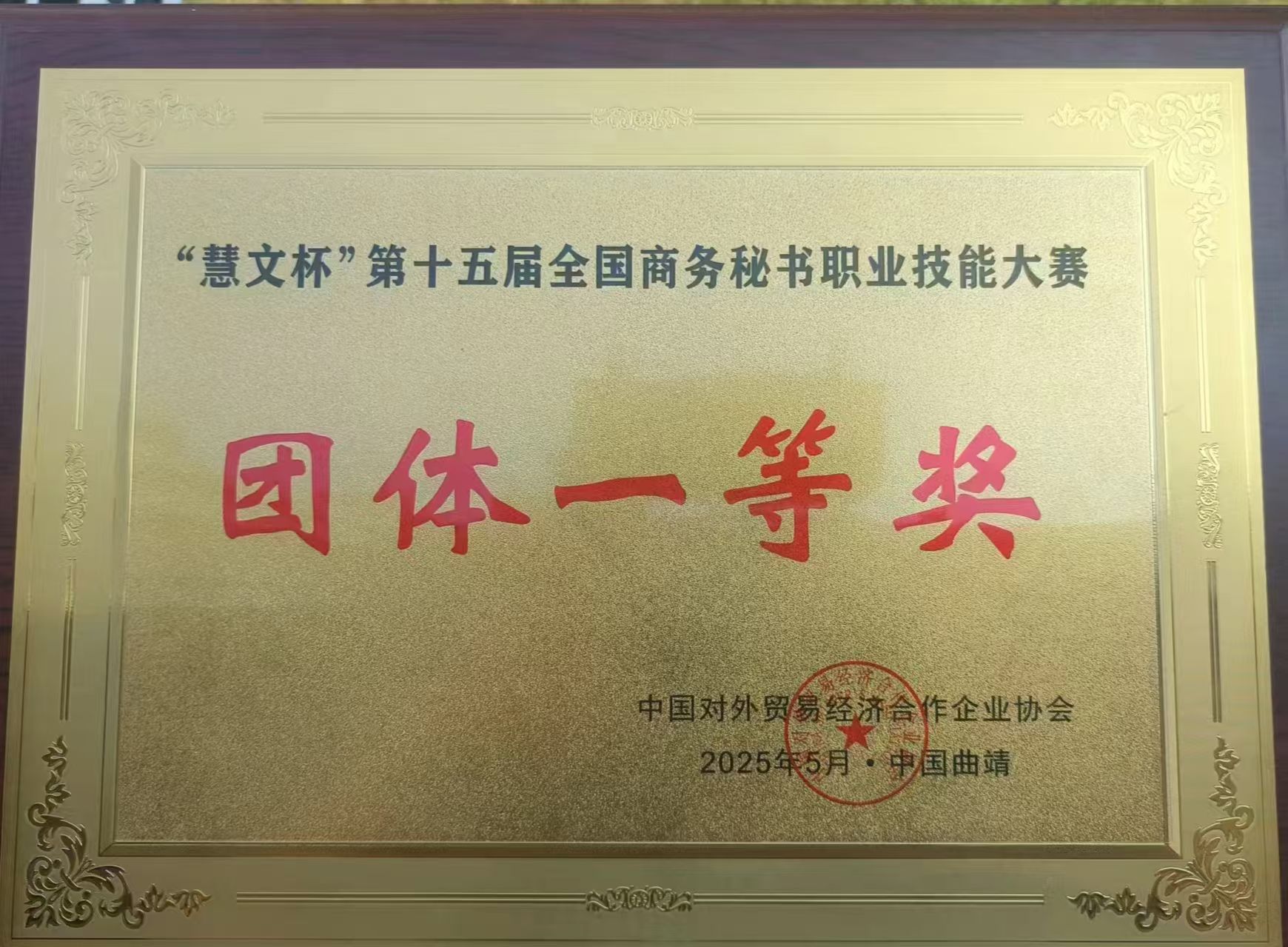 2025年5月23日至25日,“慧文杯”第十五届全国商务秘书职业技能大赛在云南曲靖盛大举行。公司学子获得团体一等奖,在个人事务处理中四人获奖,其中特等奖、一等奖各一项,并且首次获得“十佳秘书”称号。