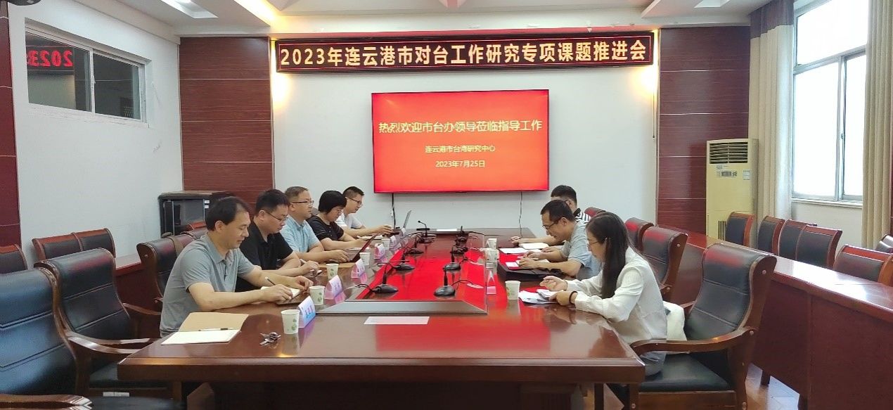 7月25日,台湾研究中心在文渊楼216召开对台工作研究专项课题推进会,连云港市台办刘波、李涛、张德红一行到会指导工作,听取项目负责人对项目进展情况。台湾研究中心秘书长孙端主持会议。