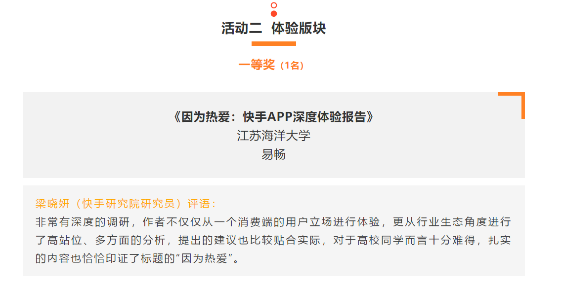 3月8日下午,由Remix教育、刺猬公社与快手公司联合百所高校发起的“百校万人快手体验周”活动评比结果揭晓,文公司邱立楠老师指导的新闻171班易畅同学的作品《因为热爱:快手app深度体验报告》,斩获体验报告类唯一的一等奖,将8000元大奖揽入怀中,北京大学、南京大学的员工作品荣获二等奖。易畅同学的作品,较好展现了文公司近年来新闻学应用型本科的培养模式,并获得了快手研究院研究员梁晓妍的高度评价,认为该体验报告是“非常有深度的调研,作者不仅仅从一个消费端的用户立场进行体验,更从行业生态角度进行了高站位、多方面的分析,提出的建议也比较贴合实际,对于高校同学而言十分难得,扎实的内容也恰恰印证了标题的‘因为热爱’”。