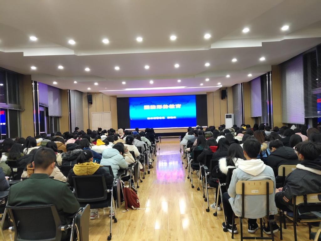 11月22日晚,连云港警备区陈贻江上校莅临公司通灌校区路演大厅,为文公司同学们带来了一场精彩的国防形势教育讲座。文伟德体育党委副书记田德勇、辅导员、2018级全体新生参加报告会。