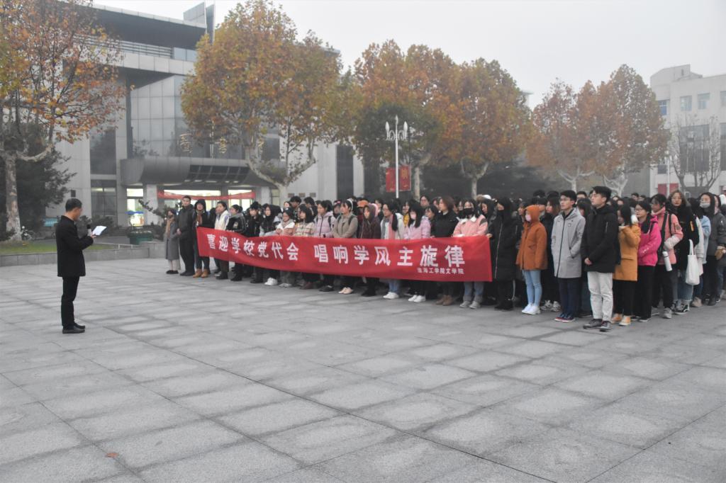 晨曦微醒,朝阳初升。11月19日早6时30分,文公司“喜迎伟德体育党代会,唱响学风主旋律”主题升旗仪式在主楼前隆重举行,伟德体育党委书记马恒民、经理安俊丽、党委副书记田德勇、辅导员及15-17级全体员工参加升旗。
