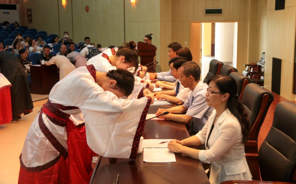 典礼在庄严的国歌声中拉开帷幕,“感谢师长·敬师献茶”仪式在悠扬古乐中展开。伴随着一段激昂动人的奉茶词,身穿庄重汉服的同学们手捧茶盏,款款走向台前,峨冠博带,云佩霓裳。他们给各位老师敬茶并行揖礼,一举一动,一言一笑,真情表达了对师长们的敬意和感恩之情。