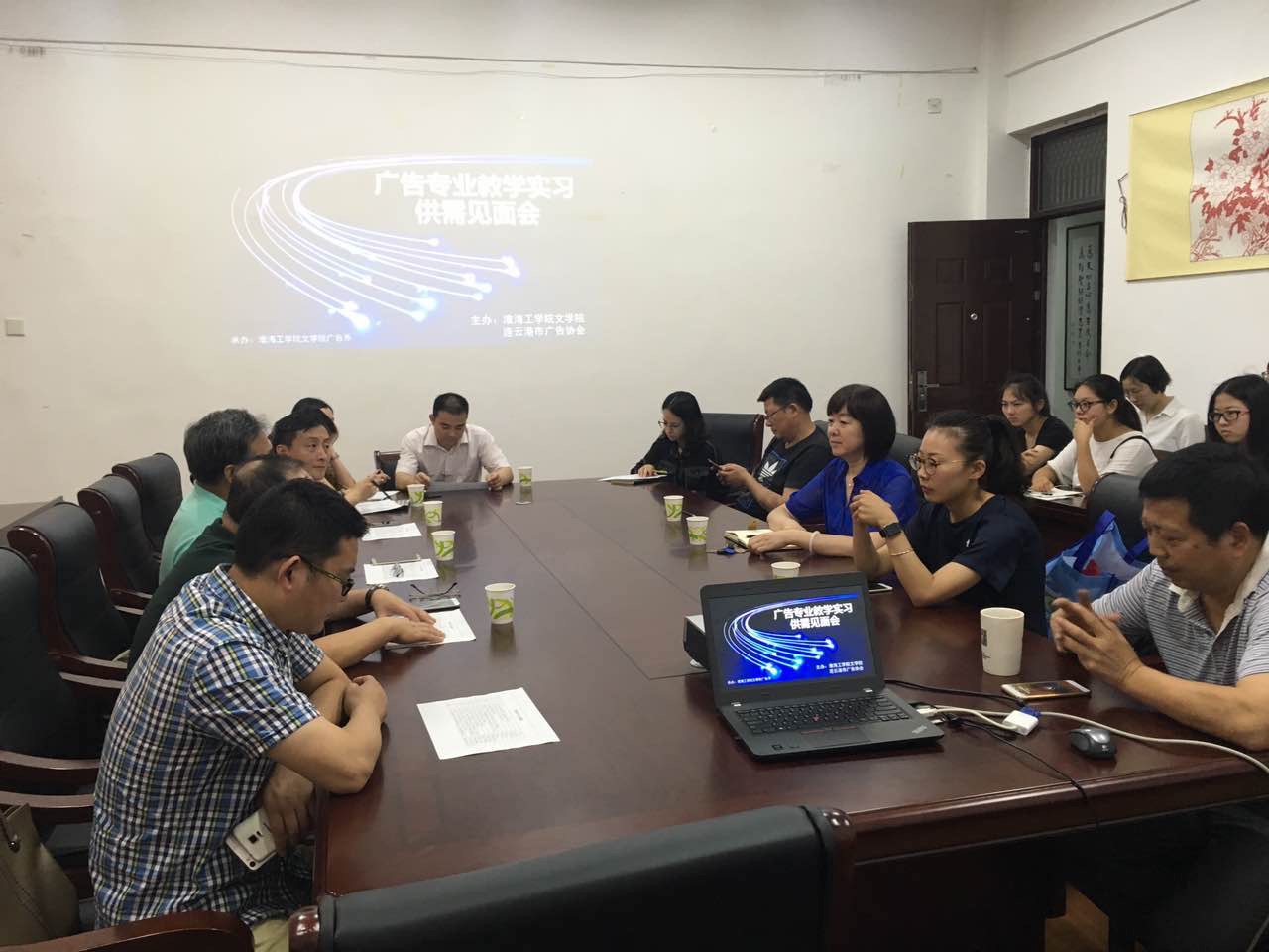 文公司和连云港市广告协会联合主办广告专业员工教学实习供需见面会于2017年6月29日上午在淮海工公司文渊楼306会议室召开。主管实践教学的文公司副经理、市广告协会会长、秘书长、以及连云港8家广告企业负责人,广告系实习指导老师和实习员工出席会议。