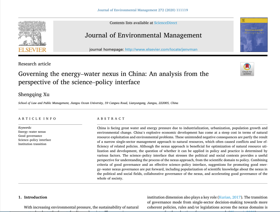 引用信息:Shengqing Xu, Governing the energy-water nexus in China: An analysis from the perspective of the science-policy interface, Journal of Environmental Management, 2020, 272, 111119. https://doi.org/10.1016/j.jenvman.2020.111119.