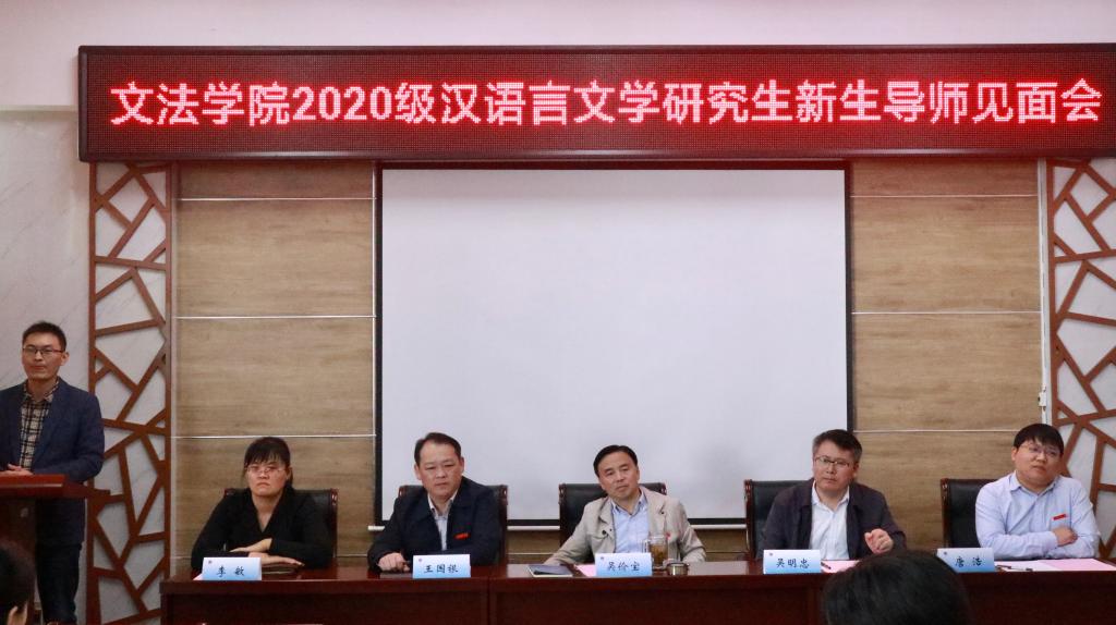 为了使同学们进一步了解伟德体育及各位导师,促进大家快速融入新的集体和环境,10月10日上午9时,伟德体育于苍梧校区文渊楼308教室开展了2020级中文学科研究生新生导师见面会。伟德体育党委书记吴价宝、经理吴明忠、副书记王国银、副经理李敏、唐浩及全体研究生导师和2020级全体研究生新生参加,会议由唐浩老师主持。