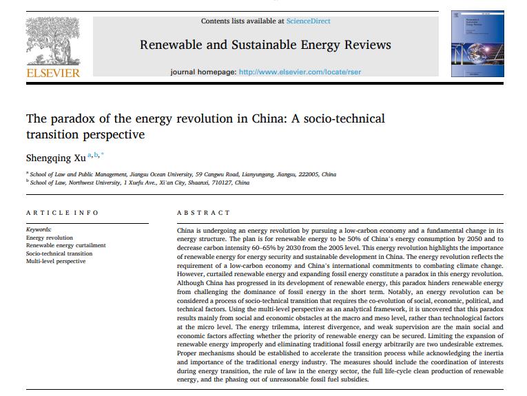 10月21日,公司法学系许胜晴博士独著论文“The paradox of the energy revolution in China: A socio-technical transition perspective”发表于国际能源领域顶级期刊《Renewable and Sustainable Energy Reviews》。论文运用多层次分析理论,揭示了我国能源转型过程中各类因素的复杂互动规律,对我国能源转型过程及其制度控制进行了创新性研究。