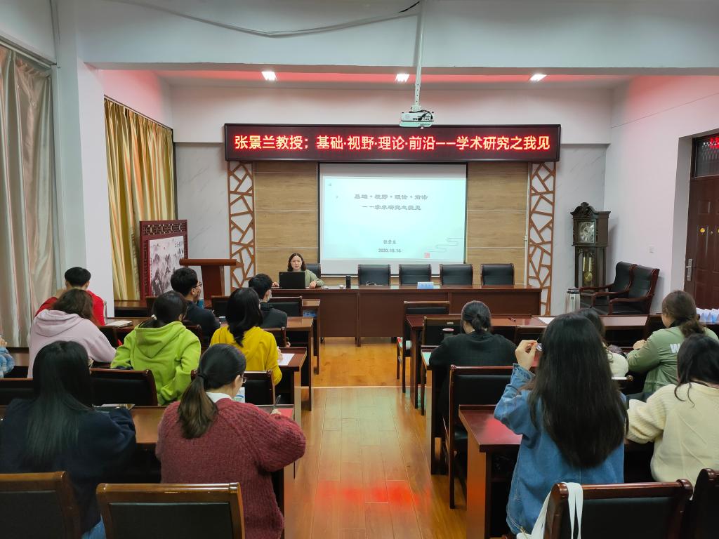 10月16日18:30,由张景兰教授主讲的“基础 视野 理论 前沿——学术研究之我见”讲座在文渊楼308成功举办。出席本次讲座的有伟德体育张景兰教授以及2020级全体研究生。