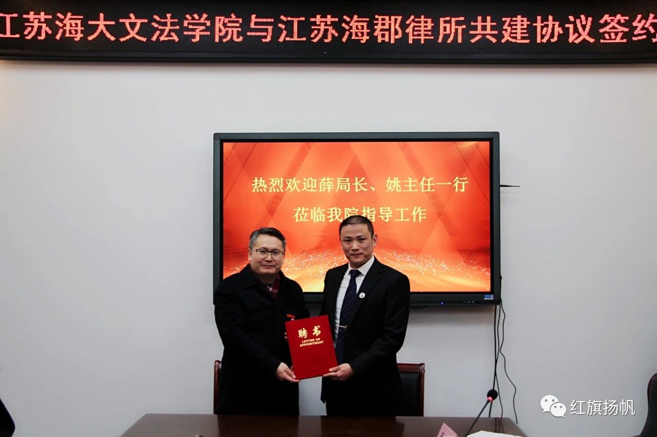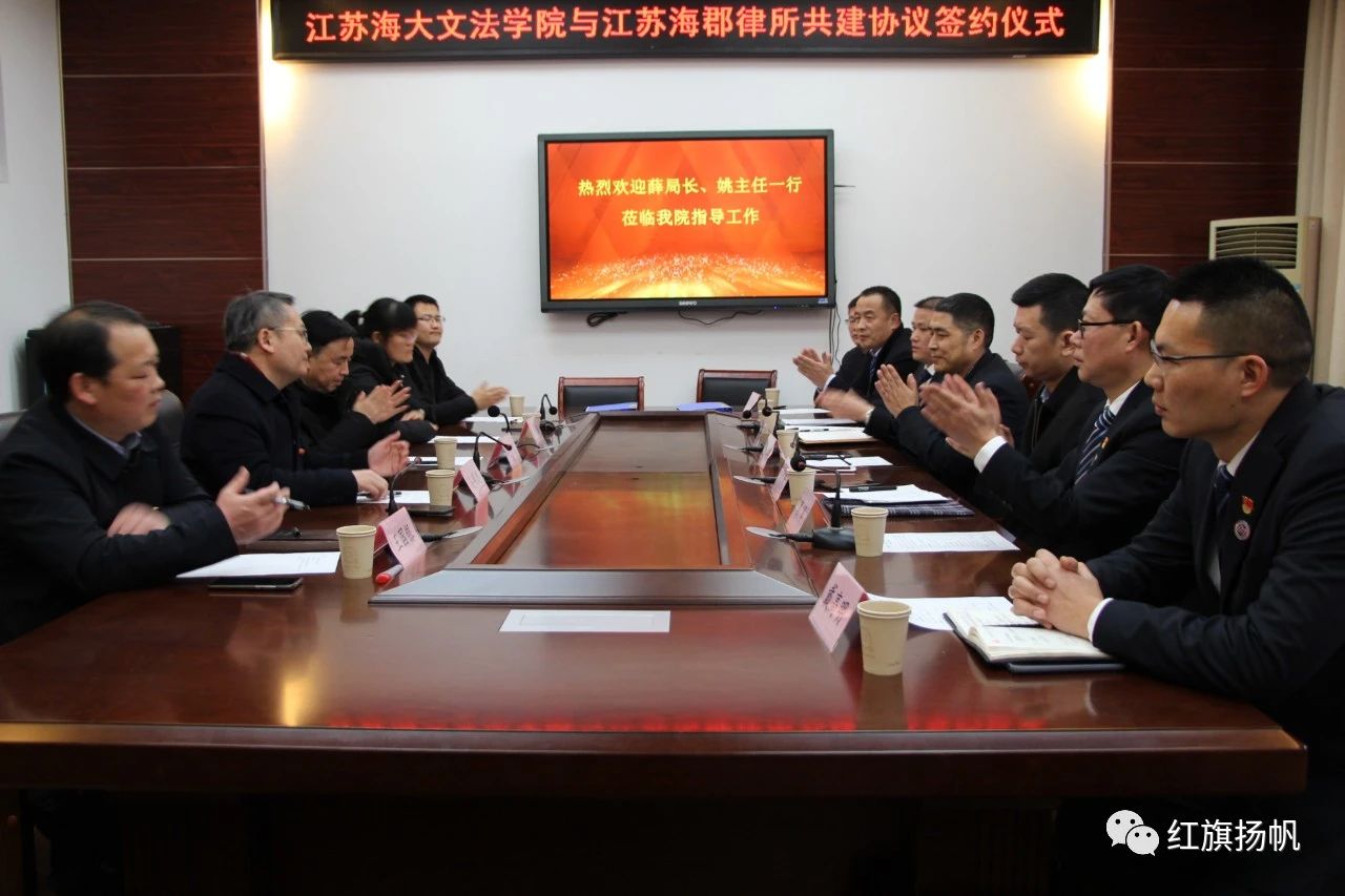 1月16日下午,伟德体育和江苏海郡律师事务所合作共建协议仪式在文渊楼216会议室举行,连云港市司法局副局长、市律师行业党委书记薛玉江、江苏海郡律师事务所主任姚德波等和公司领导班子成员及部分教师代出席签约仪式。签约仪式由李敏副经理主持。