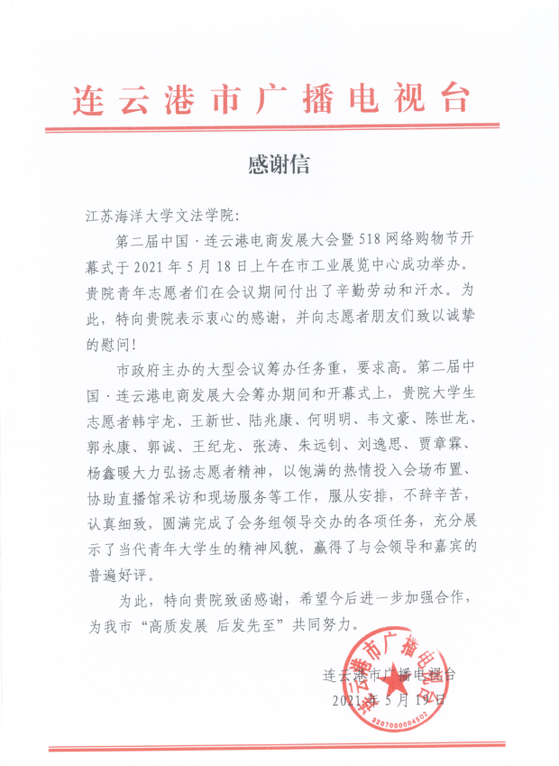 最终在18日上午11时,大会取得圆满成功。同学们在完成志愿活动的过程中,了解了连云港市电商发展的蓬勃现状,进一步加深了对本市风土人情以及对外贸易的认识。“只有在实践中不断学习,才能给未来的自己做出更充分的知识储备。”来自广告181班的志愿者陈世龙如是说。大会结束之后,连云港市电视台特别发函感谢公司志愿者的辛勤付出,并表达了今后进一步加强合作的美好愿望。