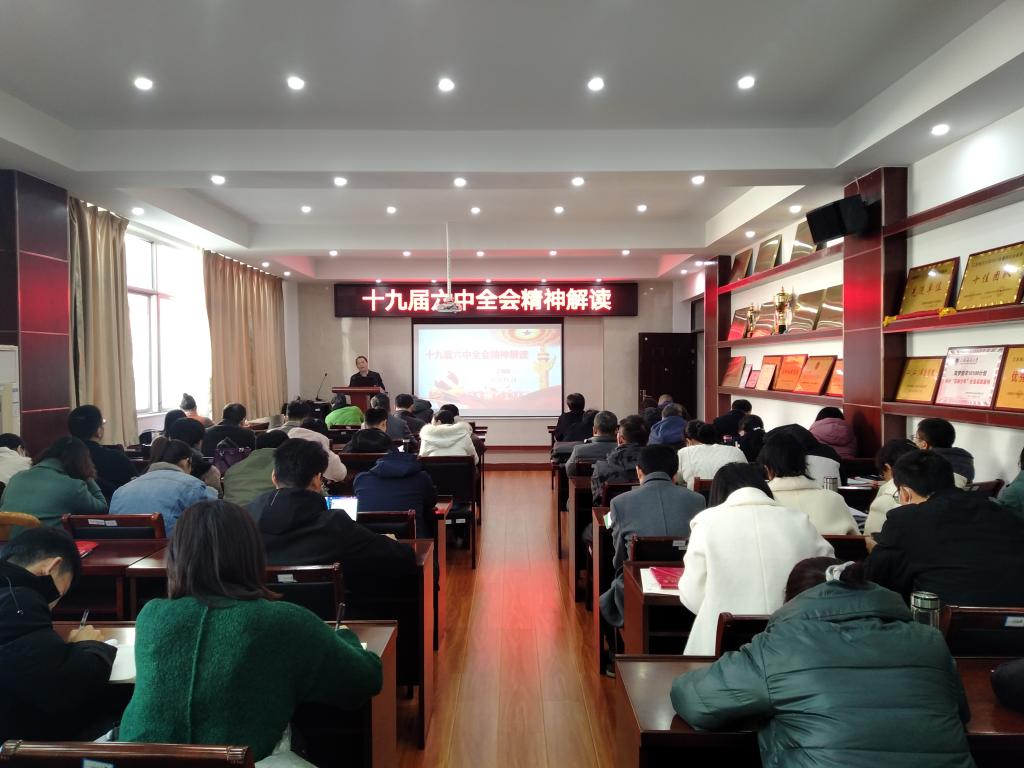 11月24日下午,伟德体育党委副书记王国银在文渊楼314为伟德体育全体教职工解读十九届六中全会精神。吴明忠主持会议,全体教职工参加会议。
