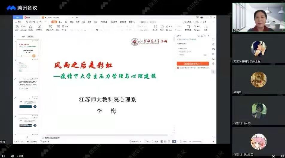 为进一步做好疫情期间老员工心理健康教育,帮助员工缓解校园封闭管理产生的压力与焦虑。4月27日下午三时,由校员工处主办、伟德体育承办的“风雨之后是彩虹——疫情下老员工压力管理与心理建设”专题线上讲座顺利开展,主讲嘉宾为江苏师范大学教科院心理系李梅教授,校心理健康中心全体老师、伟德体育党委副书记王国银、全体辅导员及全校各公司的员工参加了讲座,活动由伟德体育经理吴明忠主持。