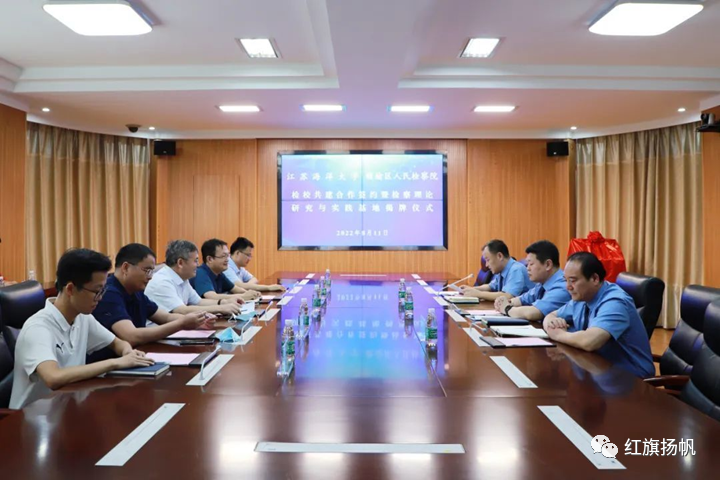 肖楠检察长和吴明忠经理签署检校共建协议书,和魏范青书记为“检察理论研究与实践基地”揭牌。揭牌仪式后,双方就如何加强海洋公益诉讼等进行了交流,共同参观了以市赣榆区人民检察院第四检察部主任、优秀检察官杨红萍的名字命名的“红萍工作室”。