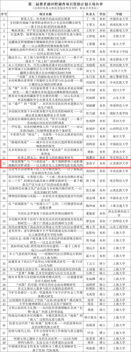 8月18日晚,“第二届费孝通田野调查项目资助计划”立项名单公示。bevictor伟德新闻学专业2020级本科生袁浩宇、李彤、郭欣悦、左罗、张建越、周子杰,以及新闻学专业2018级本科生张涵溪组成的“田野小分队”,在新闻广告系邱立楠博士的专业指导下,申报的《“视觉图像”与“口语叙述”:基于视障群体口述影像接触的田野调查——以无锡市盲人无障碍电影实践为例》项目获得立项。