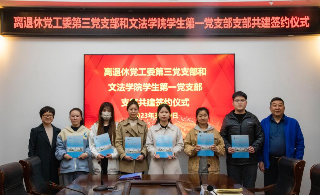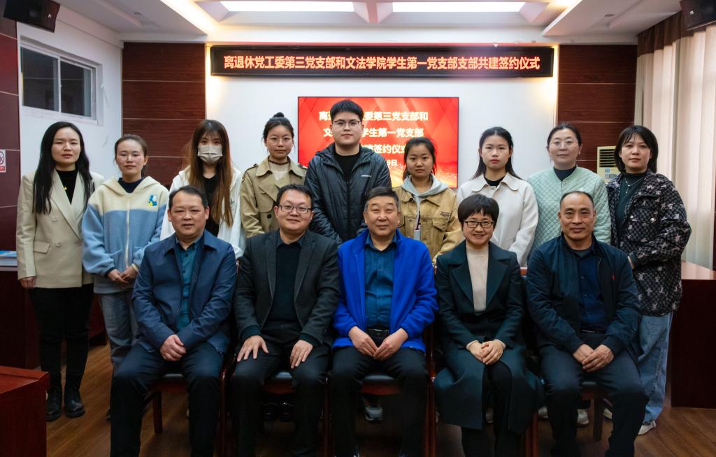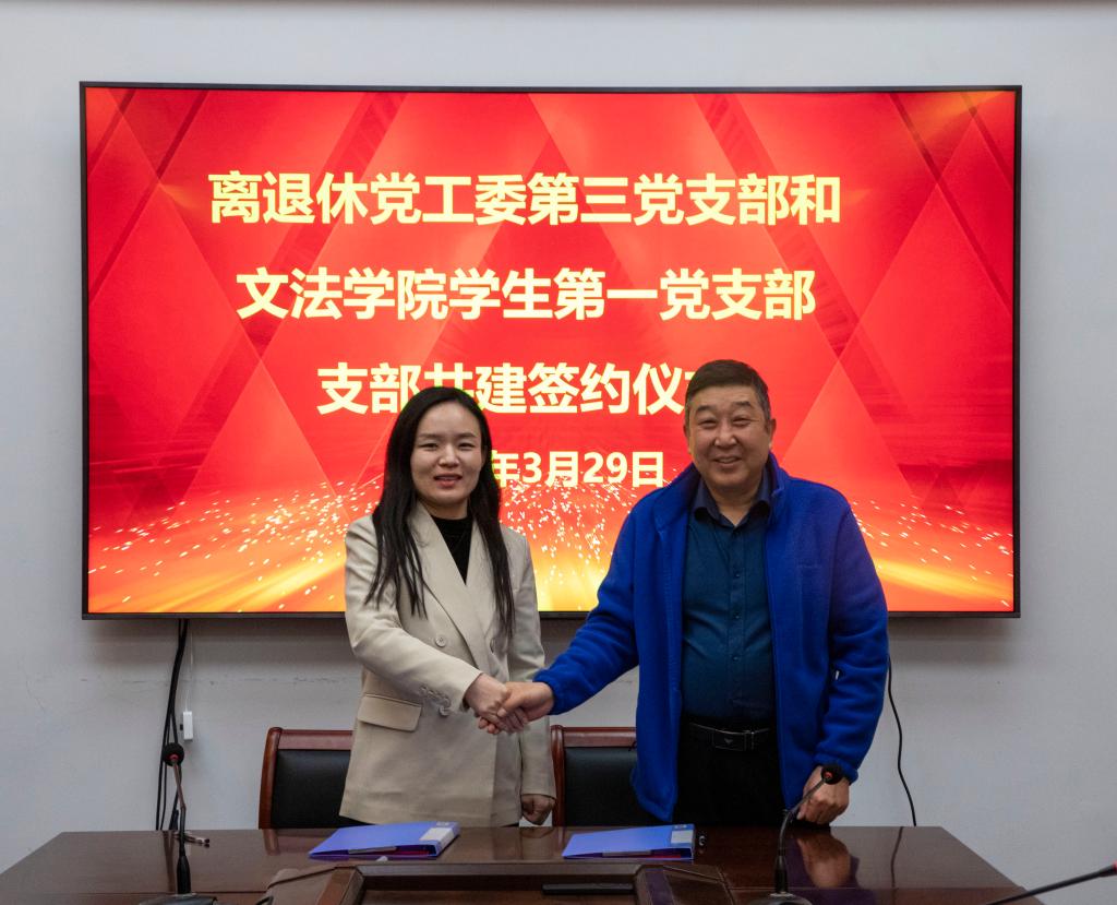 离退休党工委第三党支部书记吕振华同伟德体育员工第一党支部书记赵亚婷签订支部共建协议并合影留念。