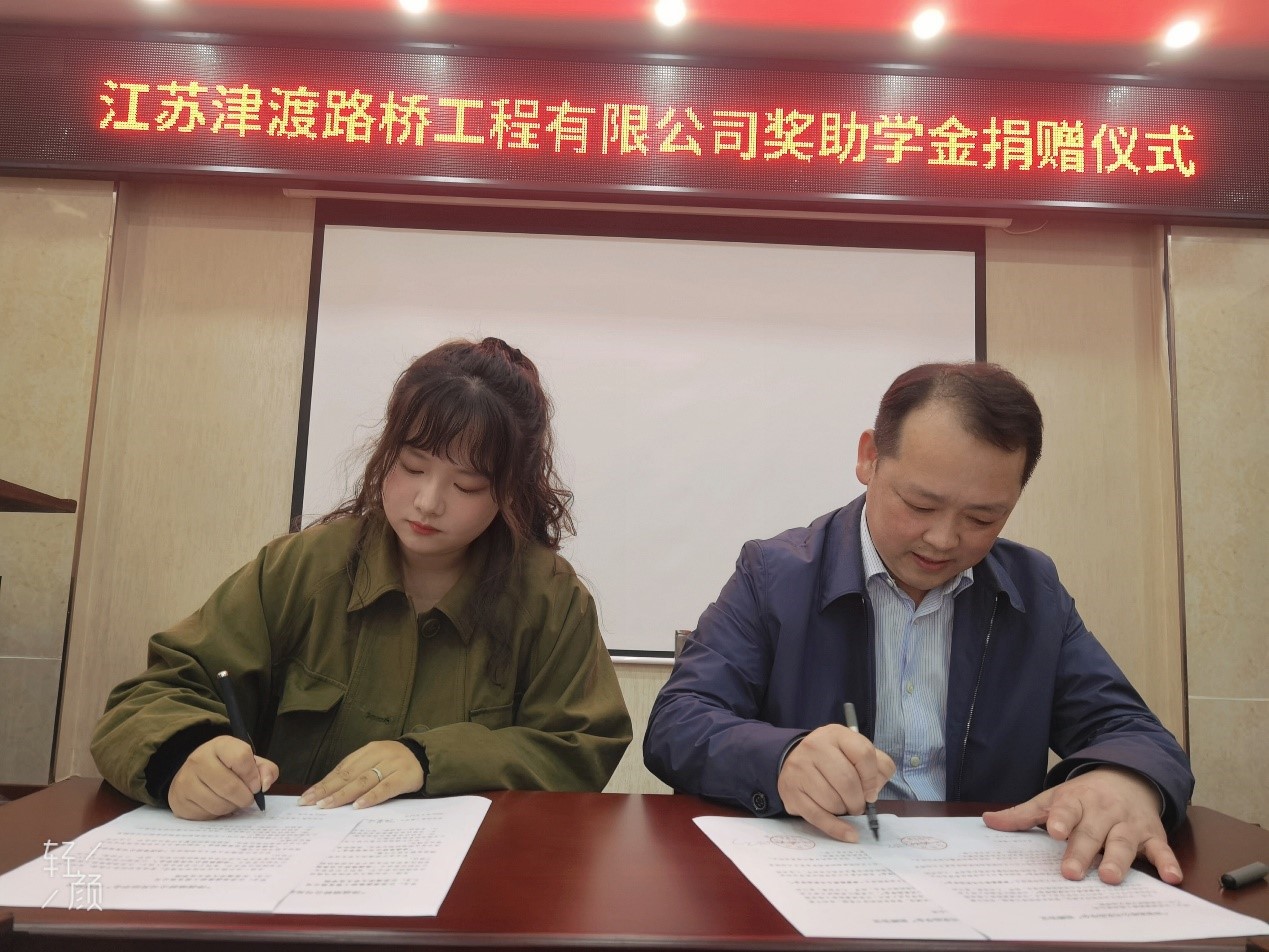 仪式上,陈美琼和王国银代表双方签订捐赠协议并举行捐赠仪式。江苏津渡路桥工程有限公司向伟德体育一次性捐赠人民币贰万元,用于奖励及资助公司里的优秀贫苦员工。