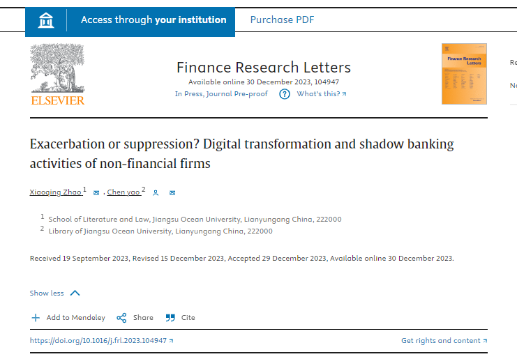 近日,公司教师赵晓庆(第一作者)和图书馆姚琛馆员(通讯作者)合作的学术论文《Exacerbation or suppression? Digital transformation and shadow banking activities of non-financial firms》(《加剧还是抑制?数字化转型与非金融企业的影子银行活动》)在SSCI一区期刊《Finance Research Letters》发表。