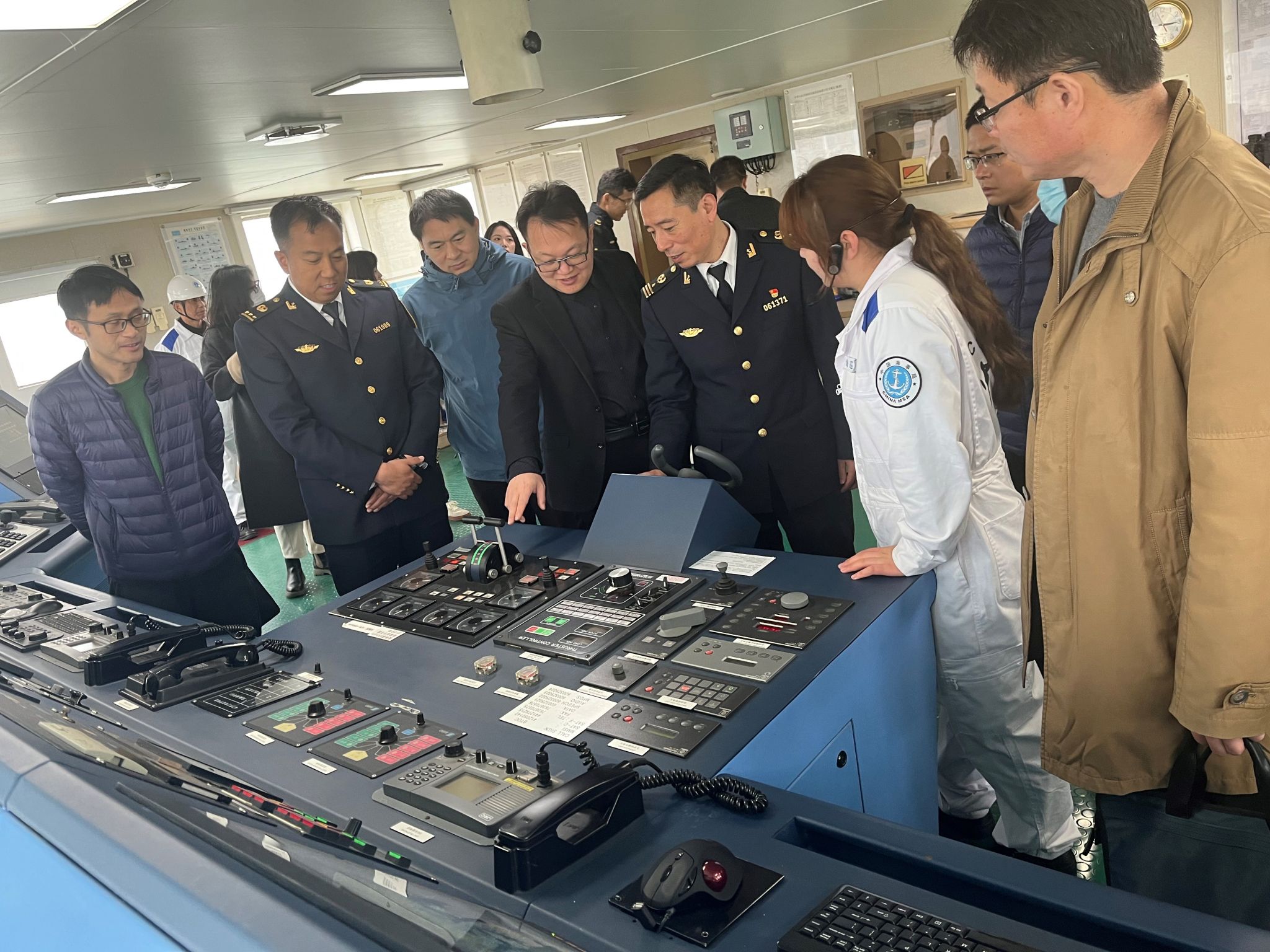 连云港海事局连云处张兴中处长对公共管理系师生的到来表示热烈欢迎,并带领大家参观了百米级海事巡逻船“海巡31”轮,该轮三副许佳欣详细讲解了“海巡31”轮的光辉历史。“海巡31”轮是我国海事系统第一艘适航无限航区、第一艘拥有直升机起降平台、直升机库和飞行指挥塔等全套船载系统的大型海巡船,列编以来作为“英雄船”“功勋船”在服务海洋强国建设中作出了突出贡献。“海巡31”轮于2023年7月12日正式编入连云港,是目前驻守在连云港海域的最大公务船艇,也是江苏沿海最大的海事巡逻船,填补了连云港乃至苏北沿海无大吨位、大马力搜寻救助公务船的空白。看到近百米的大型舰船,干净整洁,设备设施井然有序,大家深刻领略到海事局严格规范的管理秩序。最后,在该轮会议室里,双方就如何发挥党建在业务方面的引领作用,进行了深入的交流。