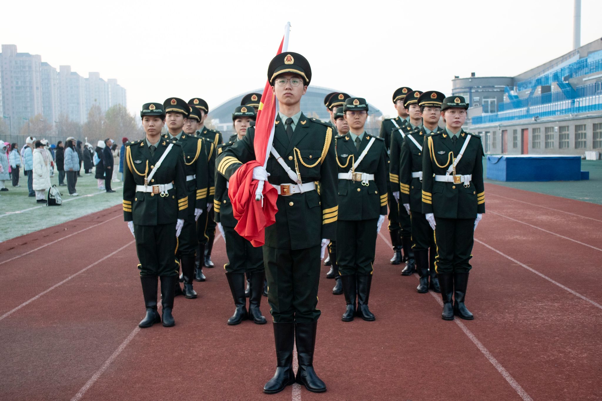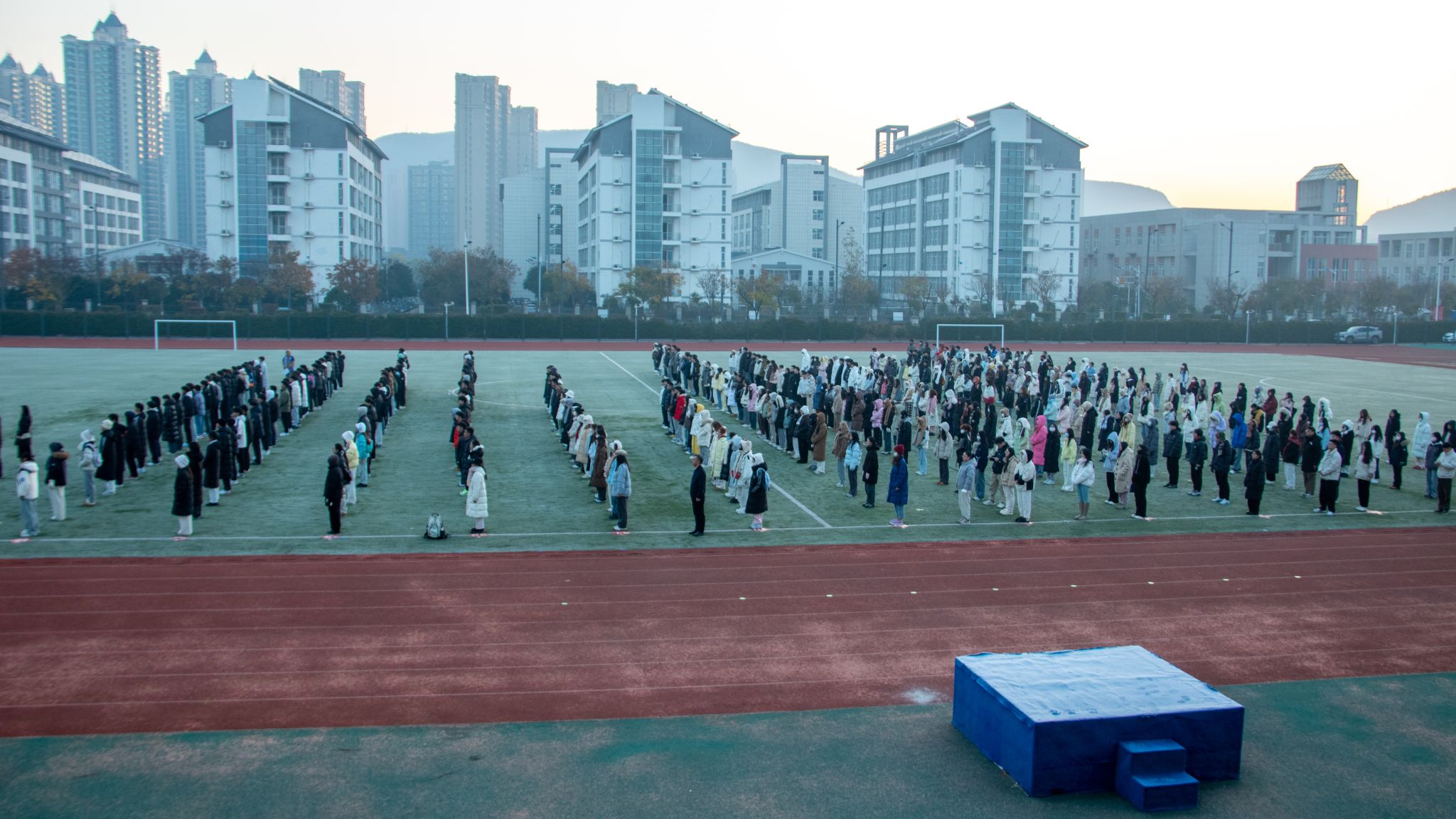 随着雄壮的国歌奏响,鲜艳的五星红旗迎着朝阳、冉冉升起,全体师生庄严肃立,面向国旗行注目礼。