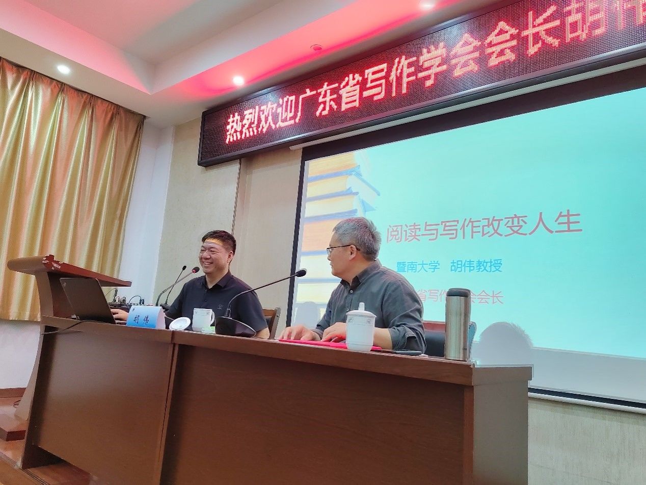当晚7点,广东省写作学会会长胡伟莅临公司,和中文系同学分享个人成长经历,畅谈写作对人生命运的积极影响。胡伟教授从中专学历、中学语文教师起步,经过多年不懈努力,成为华南师范大学文学博士、复旦大学博士后,现为暨南大学教授。他主持国家社科基金等多项高级别课题,发表学术论文数十篇,出版《河南滑县方言研究》《西汉文献动词研究》等多部学术专著,主编《大学写作》《创意写作》《公文写作》《应用文写作》等多部教材。他的自传体长篇小说《我们在路上》即将在河南文艺出版社出版。2024年1月当选广东省写作学会会长,开辟了省级写作学会教学、研究和社会服务的崭新局面。人民日报等多家国家主流媒体予以报道。