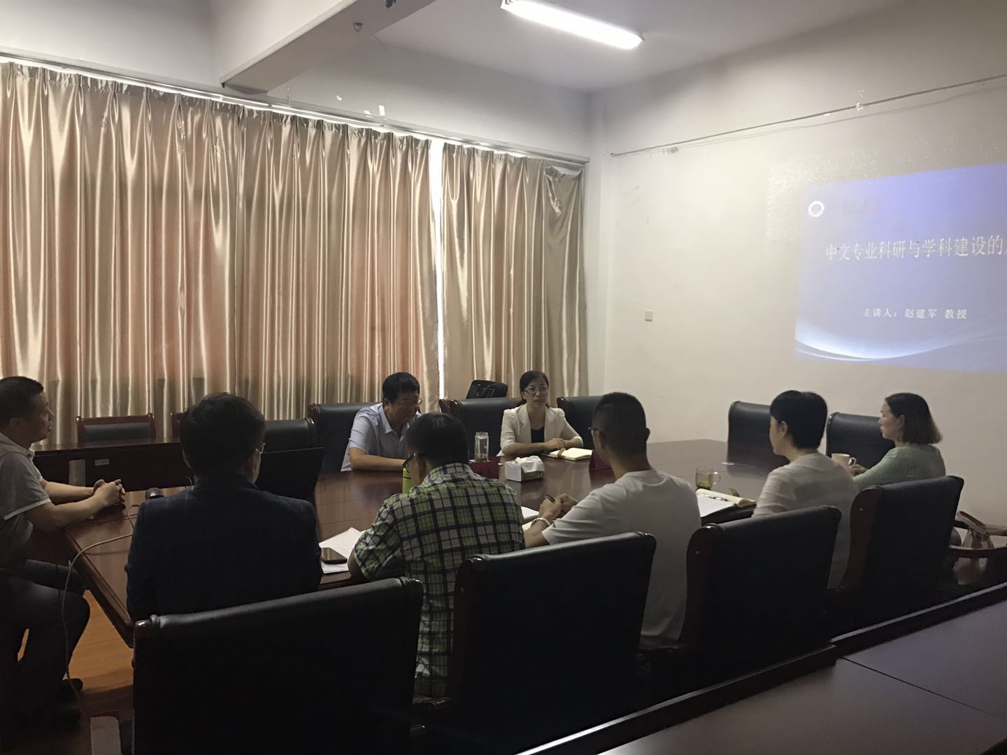 赵建军教授在了解了文公司中文专业科研和团队建设的基本情况后,结合自己的科研体会和团队建设经验,对文公司中文专业科研和团队建设的未来发展提出了许多宝贵意见。如加强文公司的中文专业的海洋特色发展,利用公司现有资源,整合关联学科协同发展。同时,赵教授针对公司教师国家社科基金申报中存在的问题进行了深入指导,指出申报老师要注意研究选题的新颖性、研究对象的针对性、研究内容的创新性和研究议题的持续性。另外,赵教授还强调在科研和团队建设中要树立合作意识,加强公司内部各专业教师之间的交流,鼓励教师以文参会等。与会老师纷纷结合自己的专业特点与教学科研工作存在的困惑向赵教授求教,赵教授都一一进行了解答。