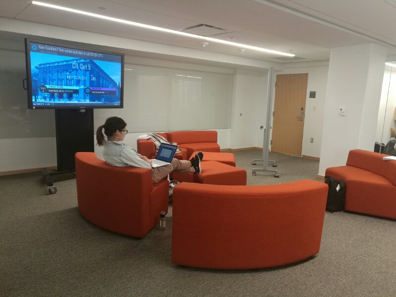 一是员工自修活动区。进门以后首先进入该区域。这一区域开放式布局,占地200多平方米,占据中心五分之一多的空间。这部分办公设备主要有:一个高度不到2米的中型可移动电子显示屏(61寸);一套橙色转圈布艺沙发;两个可移动白板;一个圆形桌子,配四把椅子;两个休闲沙发,中间放一个小型茶几;一个小长方形办公桌,配有固定电脑(无主机);一个稍大的长方形桌,配有固定电脑;一个茶吧式吧台,配有六把高脚椅;一个书桌上放一台复印打印机器。办公设备摆放按照以方便活动为宗旨,人性化安排,同时尽量节约利用空间。