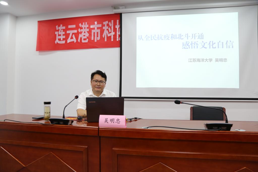 8月6日上午,连云港市科协在市委党校举办全市科协系统专兼职干部能力提升培训班。公司经理吴明忠研究员应邀作了《从全民抗疫和北斗开通感悟文化自信》专题讲座。市科协党组书记、主席杨保东,副主席郭强,市纪委监委派驻第九纪检组副组长张洪炜,纪检监察员董自强,来自市级学会、企事业科协、高校科协会长或秘书长,县区科协主席,乡镇(街道)、村(社区)科协负责同志和部分“三长一家”代表等50余人认真聆听了报告。