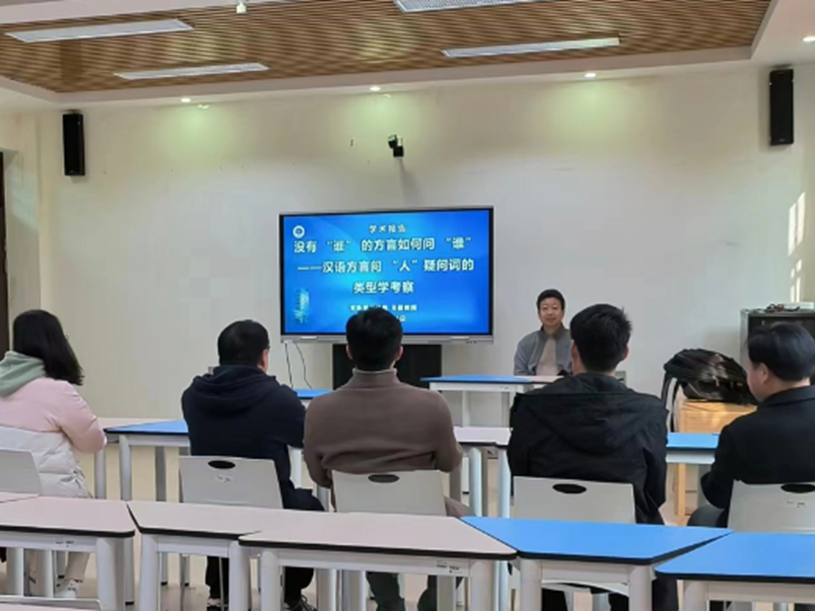 常熟理工公司王健教授讲座题目是“没有‘谁’的方言如何问‘谁’?——汉语问‘人’疑问代词的类型学研究”。王健教授从什么是疑问代词入手,通过研究汉语如何问“谁”发现用“谁”和不用“谁”的方言大致以秦岭-淮河作为分界线;并通过研究汉语周边的语言如何问“谁”,取得研究成果。王健教授讲述,这个课题他从2012年就开始研究,如何更进一步勾画出方言问“人”疑问代词发展演变的具体轨迹还需要大量的后续工作,对待学术严谨钻研的态度让各位同学受到了很大的启发。